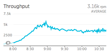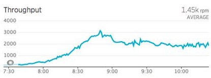 오! 아침에 많이 치솟기는 하지만 예전처럼 수업 시간표에 비례해서 계단 형태를 띄지 않고 일률적인 처리 속도를 보여주고 있었다. 확실히 xe-core를 수정한 효과가 있는 것 같았다. 그러나 기쁨도 잠시 처리량을 살펴보니 평소에 다소 못미친다는 것을 알게 되었다