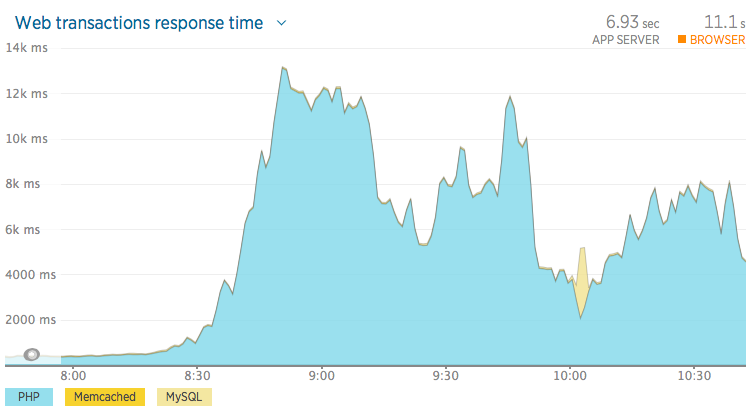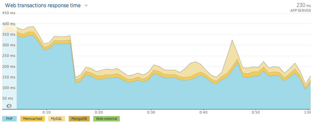 xhprof의 프로파일링 결과를 살펴보면 파일 관련 처리 함수의 실행 속도가 눈에 띄게 느리다는 것을 확인할 수 있었다. 역시 스토리지가 문제였던 것 같다. 그간 관리의 편의를 위해 XE 애플리케이션 전체를 스토리지에 넣어두고 NFS를 통해 각 웹서버로 공유해서 사용하고 있었는데 웹서버에서 요청하는 파일 수가 급격히 늘어나다보니 스토리지에서 병목현상이 발생한 것이다. XE를 각 웹서버로 옮기고 나니 확실히 효과가 있었다. 평균 반응 속도가 사용자가 붐빌 때에는 13초 그렇지 않을 때에는 4500ms 수준까지 떨어졌다.