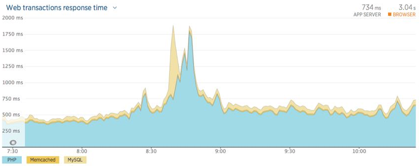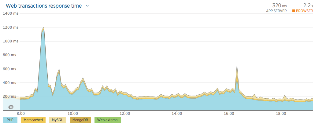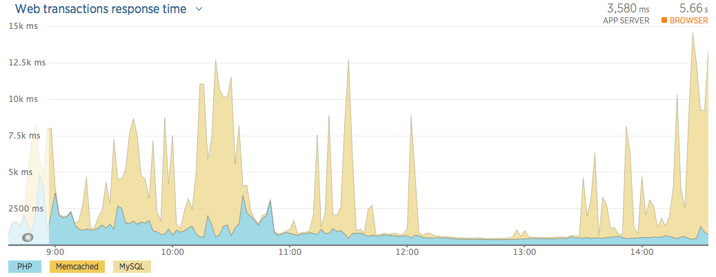 일단 무엇이 느린지 원인을 제대로 파악하려면 추측이 아니라 구체적인 데이터가 필요했다. 그래서 꾸준히 모니터링을 위한 좋은 도구들을 알아보고 있었는데 이것 저것 검색하는 도중 New Relic이라는 업체를 알게 되었다. RPM 패키지나 yum, apt-get과 같은 패키지 관리 도구를 통해서도 손쉽게 설치할 수 있는데 서버의 각종 데이터를 주기적으로 측정해서 New Relic 서버로 그 결과를 보내고 그래프 등을 통해 여러 정보를 확인할 수 있다. 무료 임에도 불구하고 매우 의미있고 다양한 데이터를 얻을 수 있다. 그 중에서 APM이라는 애플리케이션의 실행 속도를 측정해주는 서비스가 있다. 무료로도 이용가능하지만 구체적인 트랜잭션을 살펴보려면 유료 구독을 해야한다.(근데 그 가격이 상상을 초월한다.) 아무튼 APM 서비스를 통해 인디스쿨의 상태를 살펴보니 재미있는 결과가 나왔다.