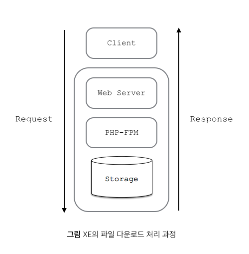 를 통해 파일을 읽어서 전달하고 있다. 이제 왜 웹서버와 php-fpm 사이의 전송량이 늘어났는지 이해가 되었다. 인디스쿨의 스토리지 서버는 분리되어 있는데 php-fpm에서 파일 다운로드 함수가 호출되면 일단 스토리지의 파일을 php-fpm 서버로 불러와야 하고 이걸 다시 웹서버로 전송하고 웹서버는 이걸 다시 클라이언트로 전송하게 된다. 그래서 다운로드가 많아지게 되면 PHP의 처리량도 늘어나고 따라서 PHP의 응답속도도 느려지게 될 것이라는 가설을 세워볼 수 있다.