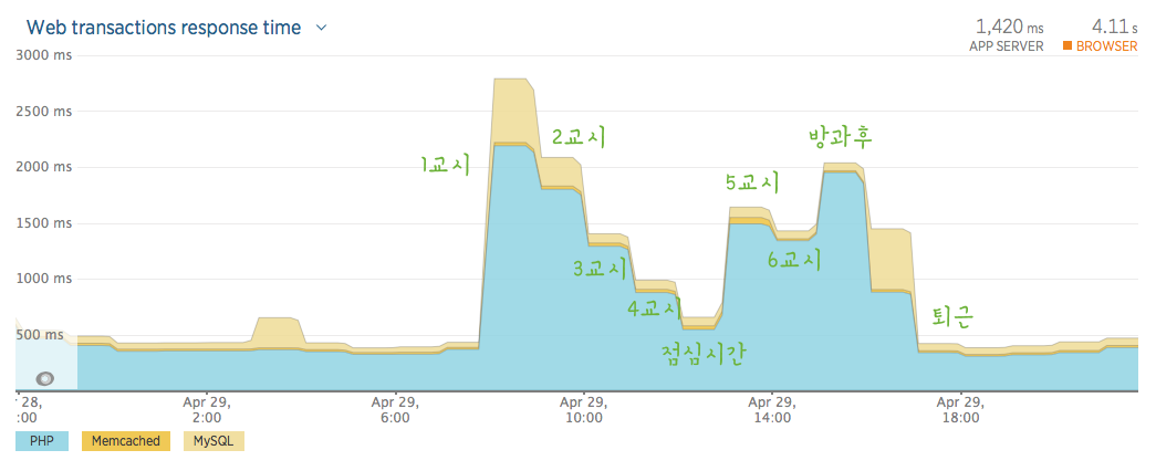 인디스쿨에 자주 들어오시는 선생님들은 아마 눈치채셨을지도 모르겠지만 며칠 전부터 인디스쿨의 속도는 매우 쾌적하다. 얼마전까지만 해도 3월 대란, 가정의 달 대란이라며 특정 시점에 인디스쿨이 엄청 느려지는 것은 물론이고 평소에도 접속자가 몰리는 아침 시간부터 오후 늦게까지 사이트 속도는 전반적으로 만족스럽지 못한 편이었다. 구체적인 수치를 언급해 보자면 속도 최적화 이전에는 서버측 애플리케이션의 응답속도가 심할 때는 10Kms를 상회했었는데 지금은 평균 200ms 수준으로 떨어졌다. 도대체 무슨 일이 있었던걸까? 그 이야기를 좀 풀어보고자 한다.