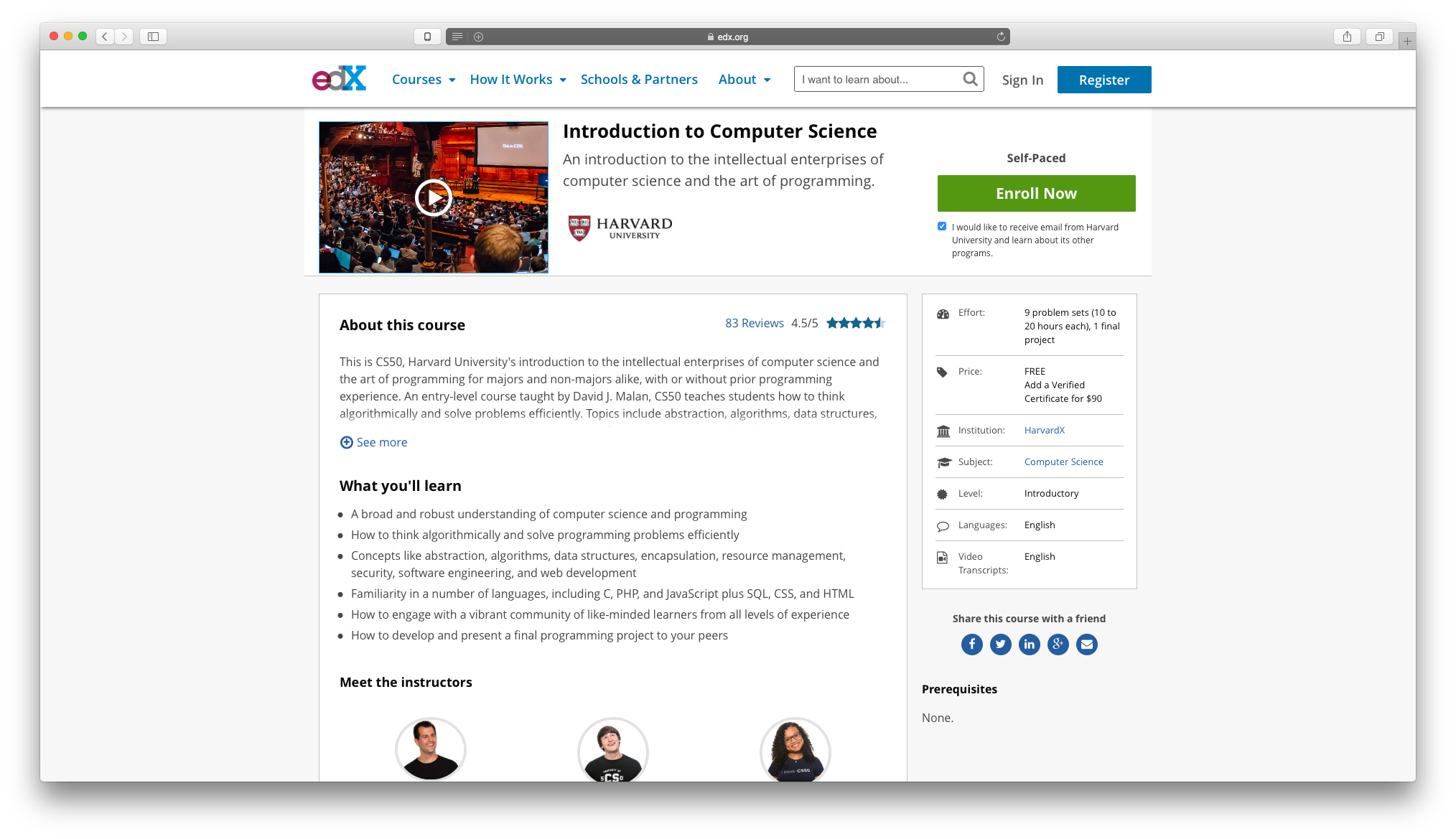 https://www.edx.org/course/introduction-computer-science-harvardx-cs50x ์ ์ ์ํ ํ โEnroll Nowโ ๋ฒํผ์ ๋๋ฅด๋ฉด ๋๋ค.