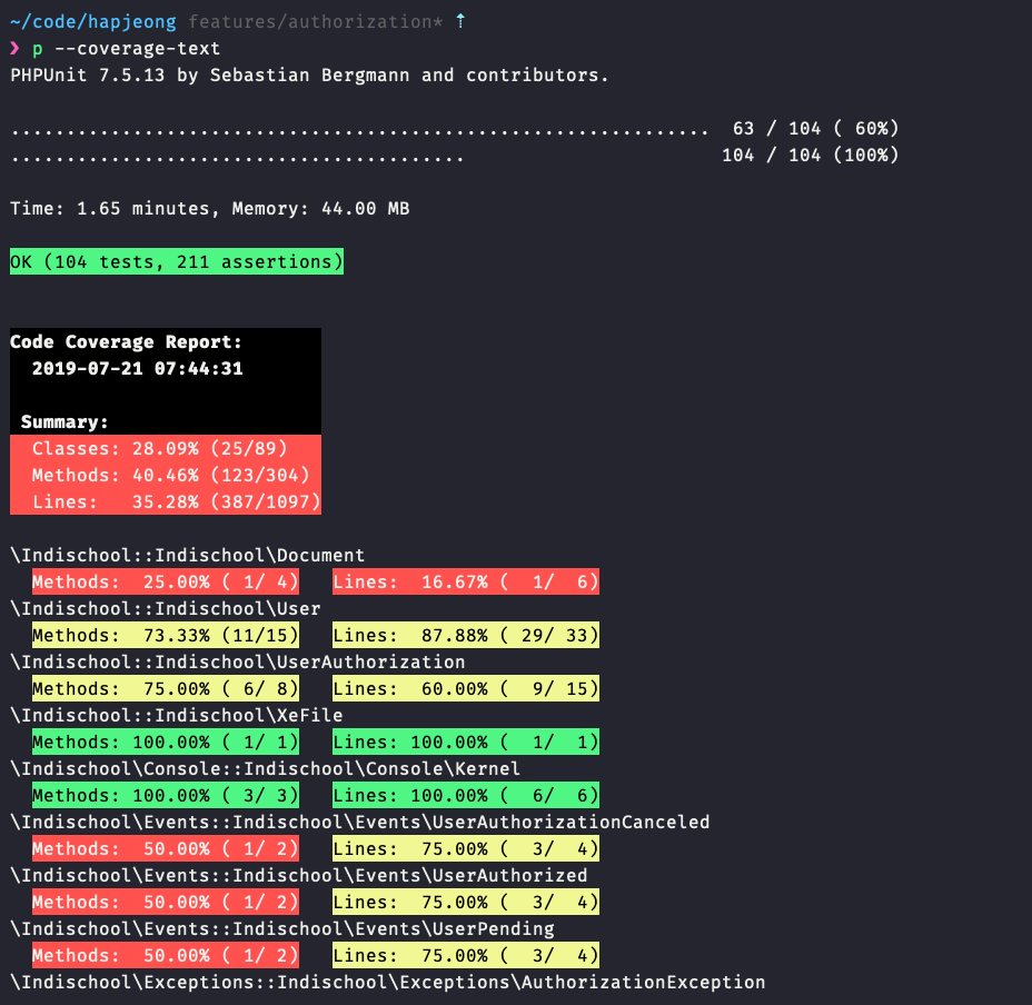 라는 옵션이 있다는 것을 이때 처음 알았는데, phpunit 문서를 살펴보니 테스트 코드가 실제 소스 코드를 어느 정도 커버하고 있는지에 대해 분석해서 text로 보고하는 옵션이었다. 이 옵션을 주면 아래와 같이 phpunit 결과가 출력된다.