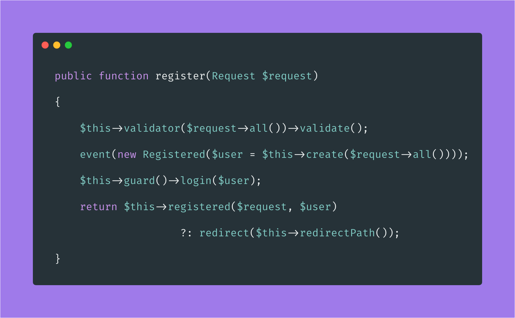 trait에 아래와 같이 빈 메서드로 존재하는데 등록이 완료된 이후에 어떤 처리를 원한다면 이곳에 코드를 작성하면 된다. 하지만 RegistersUsers