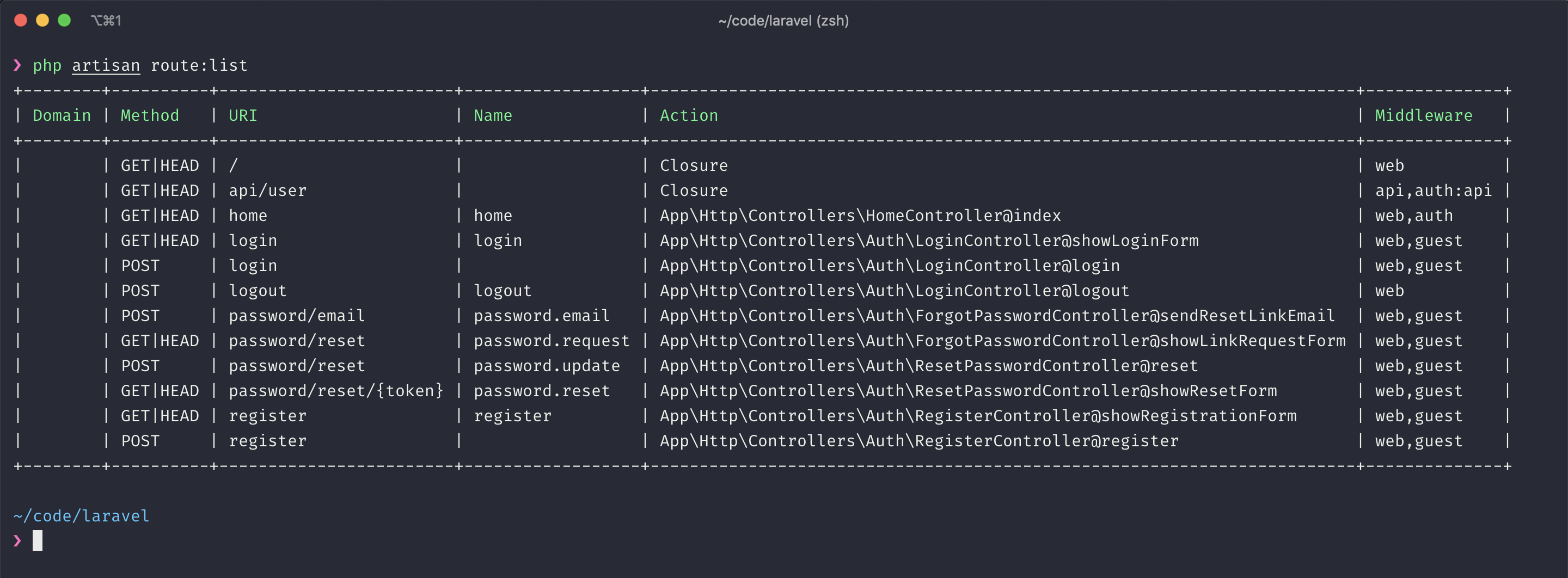 Laravel에는 회원 가입, 로그인, 비밀번호 찾기 등 사용자 인증 기능이 기본적으로 탑재되어 있다. 프로젝트 루트 디렉토리에서 php artisan make:auth