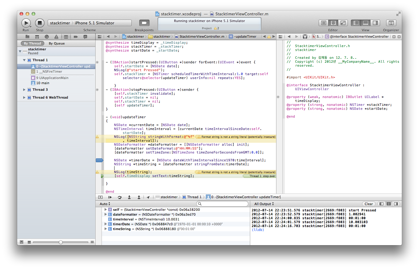 새로워진 부분들은 잘 이해가 되지 않는 것도 있지만 iTunes U - iPad and iPhone Application Development를 통해서 알아가고 있으니 차차 좋아질 것이라고 생각한다. 여하튼 소스코드를 참고해서 실행을 시켜보니 Timer가 제대로 가지 않고 00:01:00 만 계속 출력되는 것이었다. 처음에는 무엇이 문제인지 알 수가 없어서 공부하는 셈치고 NSTimer, NSDate의 Reference를 훑어보았다. 하지만 아무리 살펴보아도 문법에 어긋나거나 잘못된 부분을 찾을 수가 없었다.