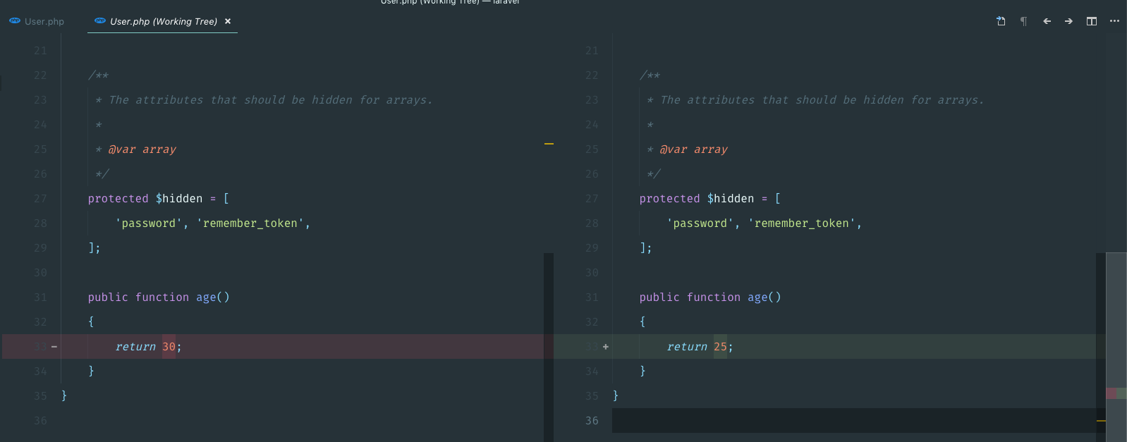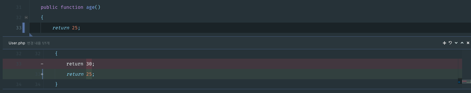 마지막 commit 이후로 파일에 변경사항이 생기면 파일 이름의 색깔이 변하거나 코드의 좌측에 선이 생기는데 선을 클릭하면 diff를 보여준다.