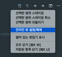 보기-SCM(⌃⇧G)에서 변경된 파일 내역을 보고 커밋하거나 변경 내역을 취소할 수도 있다. 변경된 파일을 선택하면 마찬가지로 diff가 뜨는데 좌우로 비교하는 것이 싫다면 우측의 … 메뉴를 눌러 인라인뷰를 설정하면 된다.