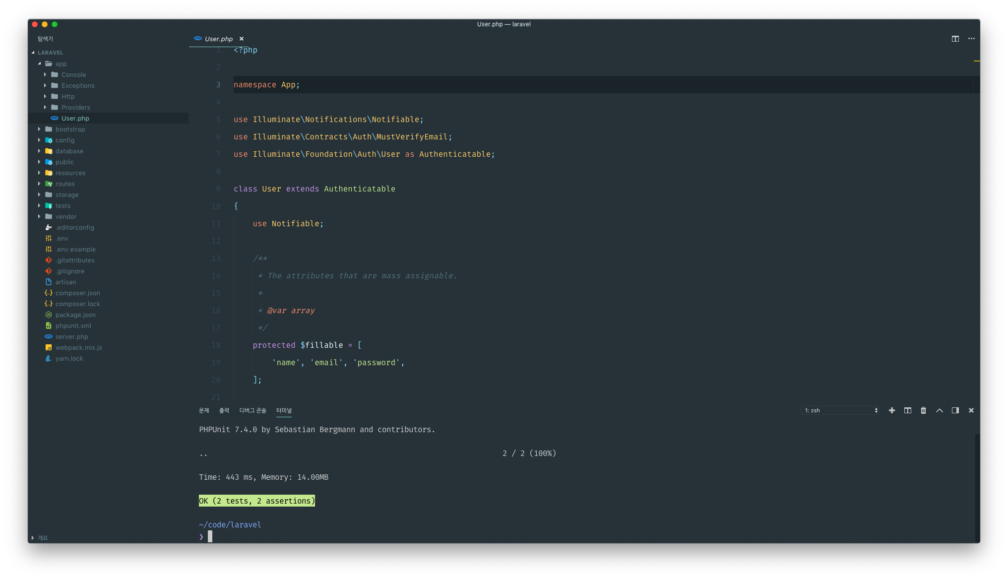 같은 명령을 실행시켜두고 소스 코드 수정시 자동으로 빌드되게 할 수도 있고 Artisan 명령이나 Git 명령, PHPUnit이나 phpspec 등도 실행할 수 있다. 물론 Artisan이나 Git, 테스트용 확장 프로그램이 있어서 반드시 터미널을 사용해야 하는 것은 아니다.